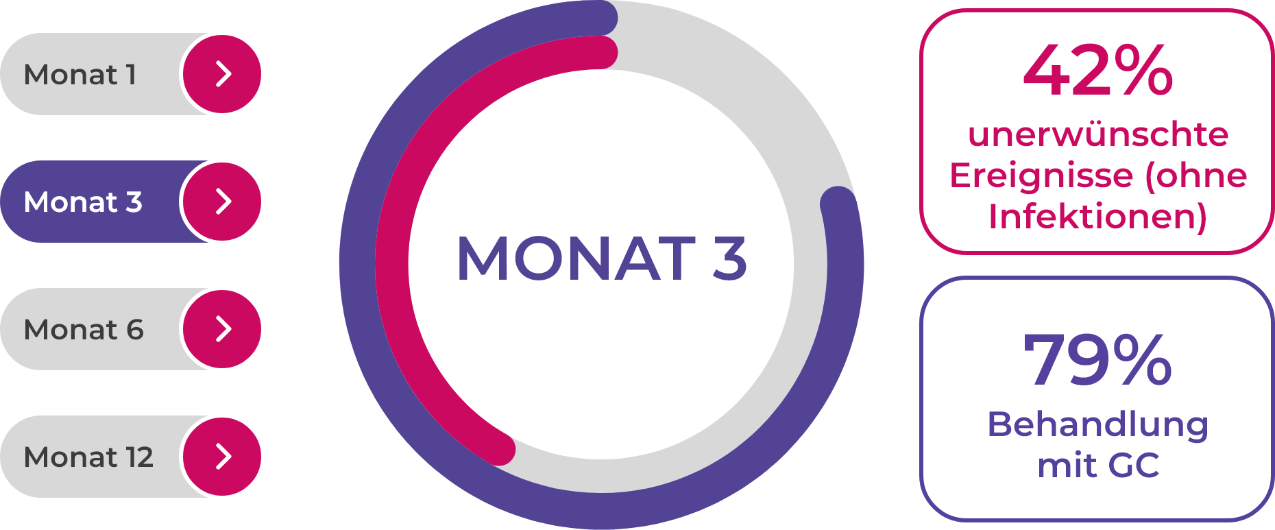 Während der ersten zwölf Monate der Behandlung von GPA- oder MPA-Patienten treten häufig UE auf.1,2 Während dieser Zeit ist die Glukokortikoid-Dosierung üblicherweise am höchsten, da die derzeit bestehenden Behandlungsrichtlinien die Verabreichung von GCs zur Remissionsinduktion empfehlen.1,2