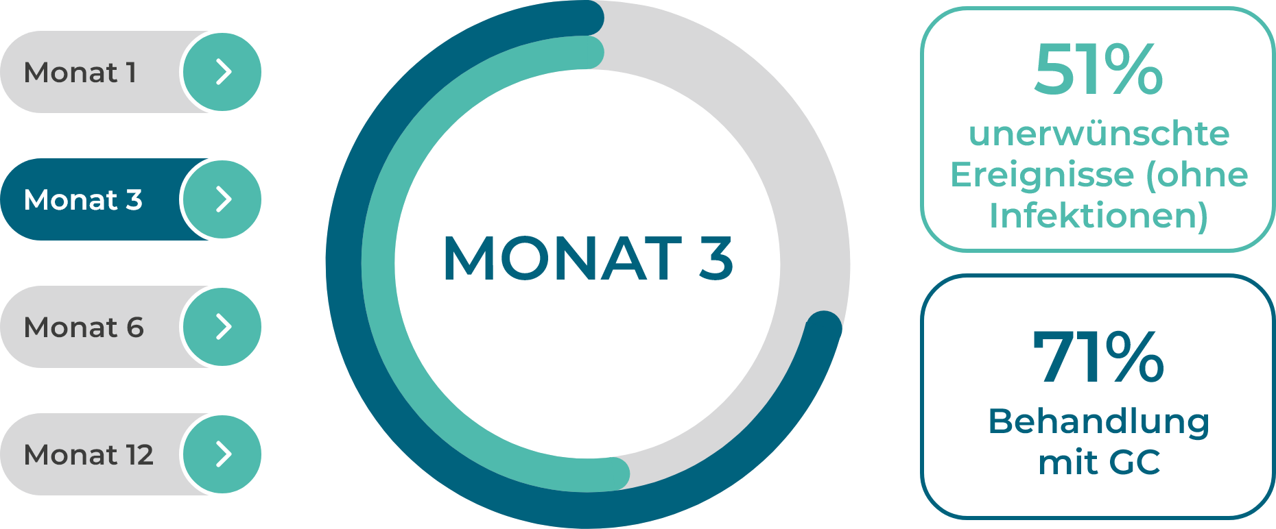 Während der ersten zwölf Monate der Behandlung von GPA- oder MPA-Patienten treten häufig UE auf.1,2 Während dieser Zeit ist die Glukokortikoid-Dosierung üblicherweise am höchsten, da die derzeit bestehenden Behandlungsrichtlinien die Verabreichung von GCs zur Remissionsinduktion empfehlen.1,2